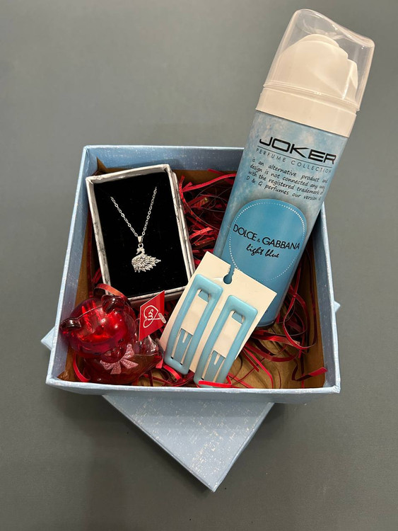 محتویات پک : ( گردنبند قو ، اسپری بدن با رایحه عالی ، گیره مو ، اسمارتیز خرسی ، باکس و پوشال )