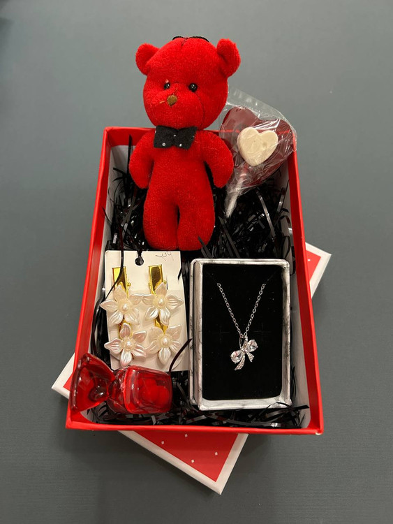 محتویات پک : ( گردنبند پاپیون ، خرس ، گیره مو ، آبنبات خرسی ، شکلات اسمارتیزی، باکس و پوشال )